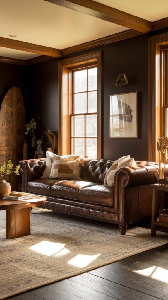 Leather furniture pairs beautifully with dark living room ideas. It adds warmth, texture, and a touch of masculinity that feels balanced and cozy. I personally love brown or cognac leather against dark walls.