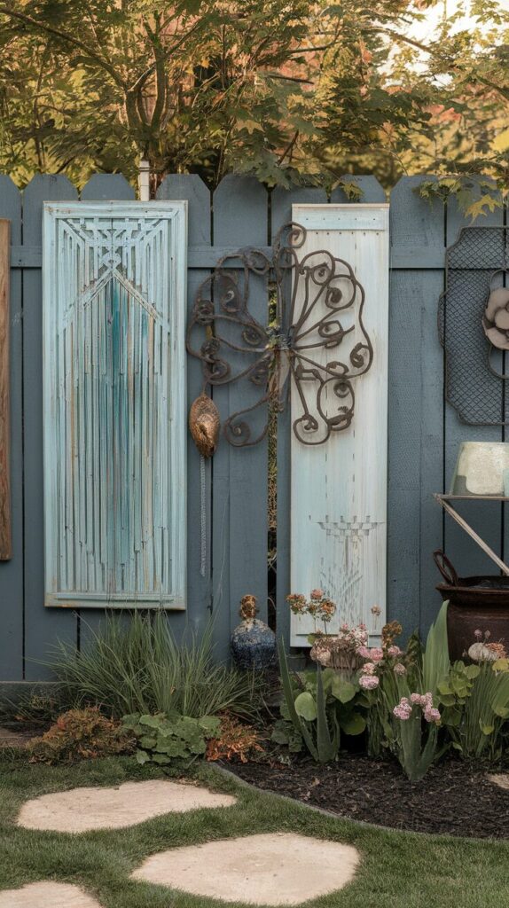Art doesn’t belong only indoors. I’ve seen backyards transformed with mirrors, metal pieces, and painted boards. DIY backyard art lets you express personality without spending much.