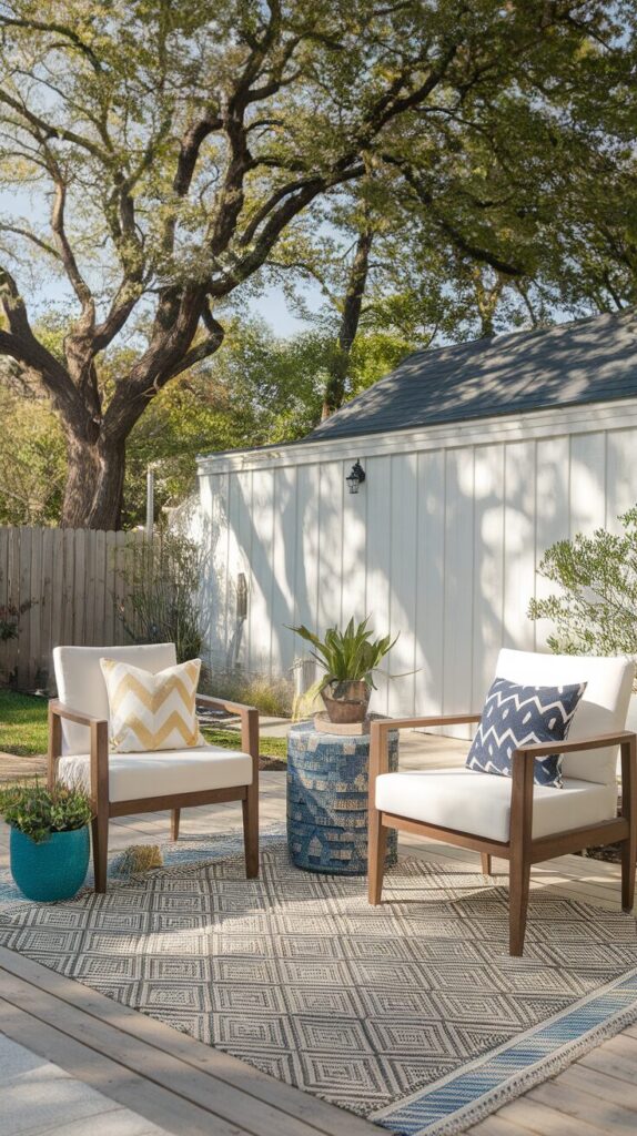 Outdoor rugs feel underrated, but they work like magic in DIY backyard ideas on a budget. Rugs define spaces without building anything permanent. I use one under my seating area, and suddenly it feels like an outdoor living room.