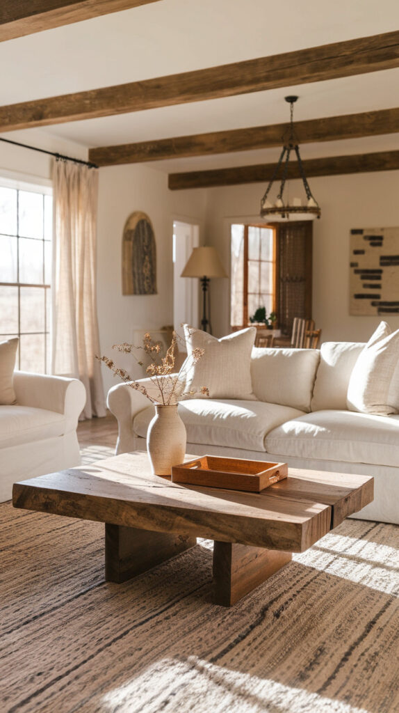 A chunky wood table gives your living room a strong visual anchor. Farmhouse style needs at least one “heavy” piece so everything else doesn’t feel like floating décor.