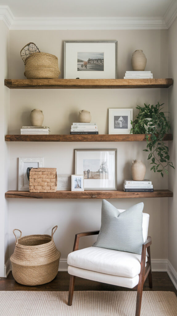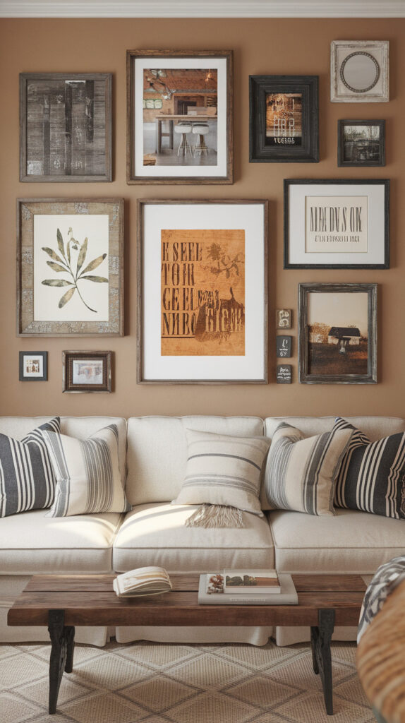 A gallery wall fills empty wall space and creates a focal point without needing one giant piece of art. It also adds personality, which farmhouse style needs to feel authentic.
