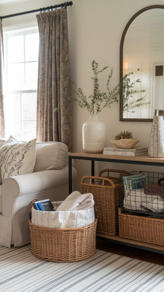 Use fewer, larger décor pieces, keep surfaces simple, and give every “stuff category” a home like a basket or cabinet.