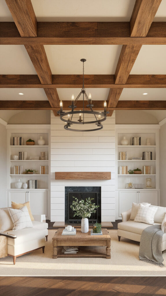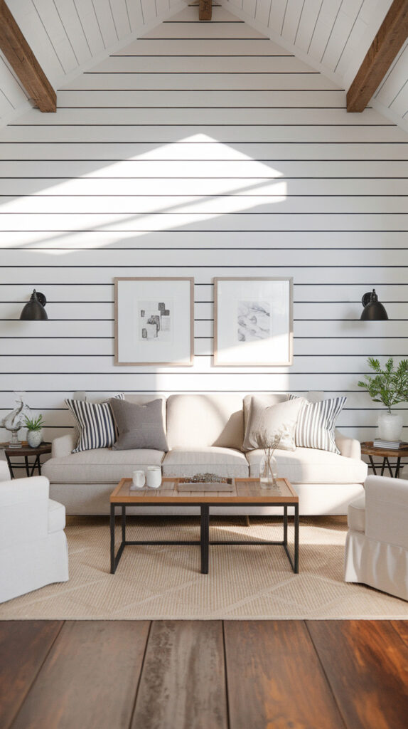 Don’t add shiplap to every wall unless you want your living room to feel like a beach rental. One statement wall feels intentional, while full-room shiplap can start looking like a theme.