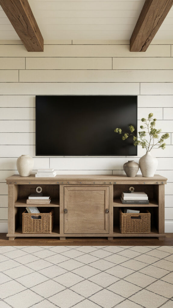 Distressed wood adds rustic character and makes the TV zone feel less like an electronics corner. Farmhouse design needs warmth, and wood furniture brings it naturally.