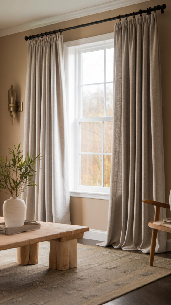 Curtains frame the room and make ceilings feel taller. Farmhouse style needs soft fabric layers to balance all the wood and metal textures.