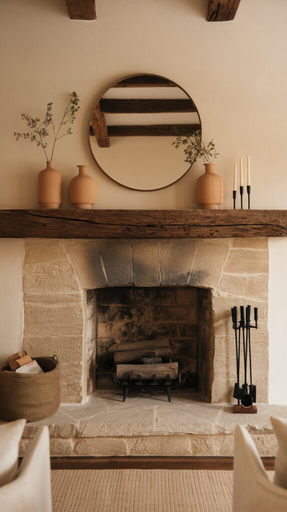A rustic mantel creates a strong horizontal line that visually anchors the room. It also gives your eyes a place to land, which makes the living room feel calmer.