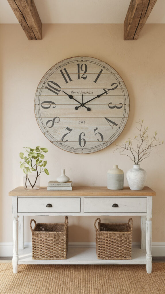 A large clock acts like wall art but feels more practical. Farmhouse style leans heavily on everyday objects turned into décor, and clocks fit perfectly.