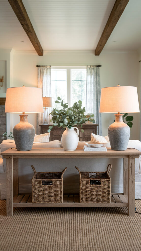 Do one last pass for “real life” issues like cord visibility, blanket overflow, and traffic paths. A farmhouse living room should look nice, but it should also feel easy to live in without constant resetting.