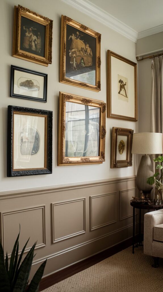 Stick to one theme — like black-and-white photos, sketches, or vintage prints — so it feels cohesive rather than chaotic. Antique golds, deep woods, or matte black frames tie it all together.