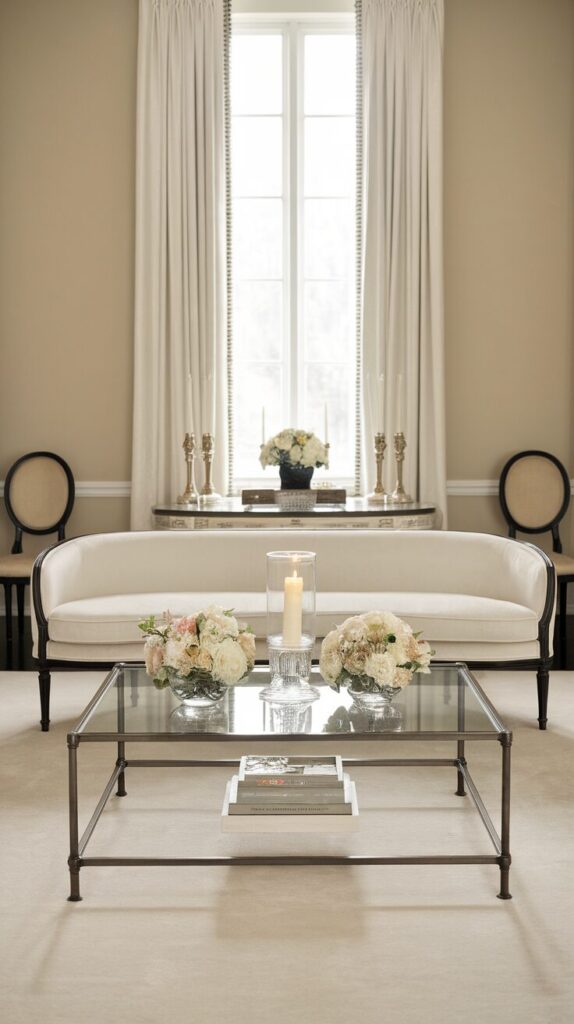 A glass-top table reflects light, while marble adds a cool, timeless quality. Both are easy to style with floral arrangements, books, or a small tray of candles.