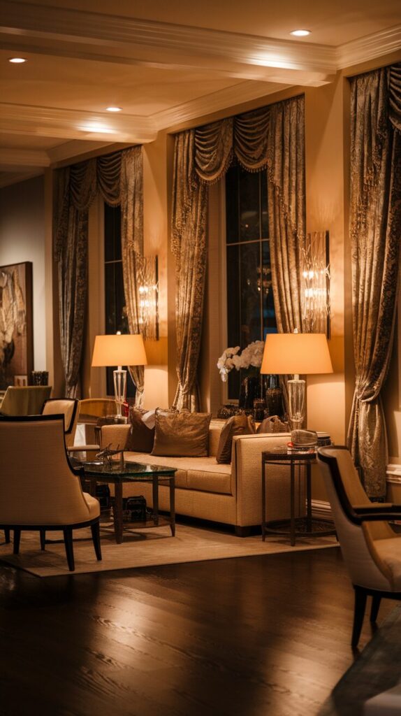 As the sun sets, mood lighting becomes your best friend. Table lamps with warm bulbs or wall sconces with a soft glow make the room feel cozy yet refined.