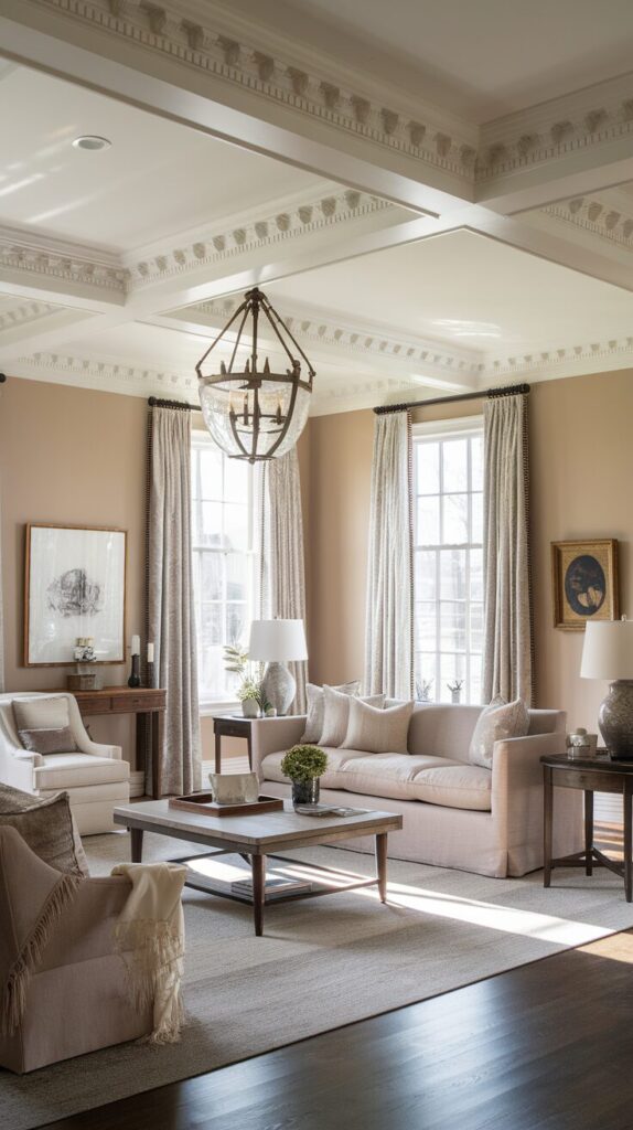 Next, assess your architectural elements. Ceiling height, window placement, fireplace location, and natural light all influence how formal the room can feel. High ceilings can support dramatic lighting, while smaller spaces benefit from refined details like molding and vertical curtains.