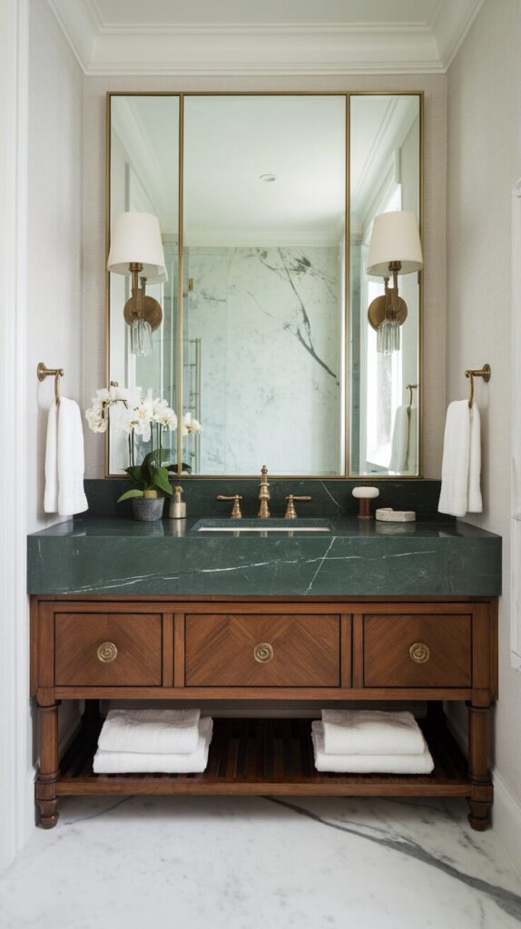 This idea works well for countertops or shelves. Green marble adds richness without overpowering the room. It feels special and intentional.