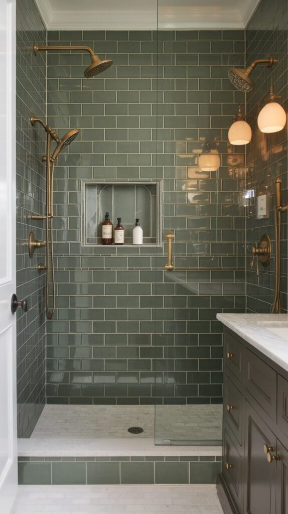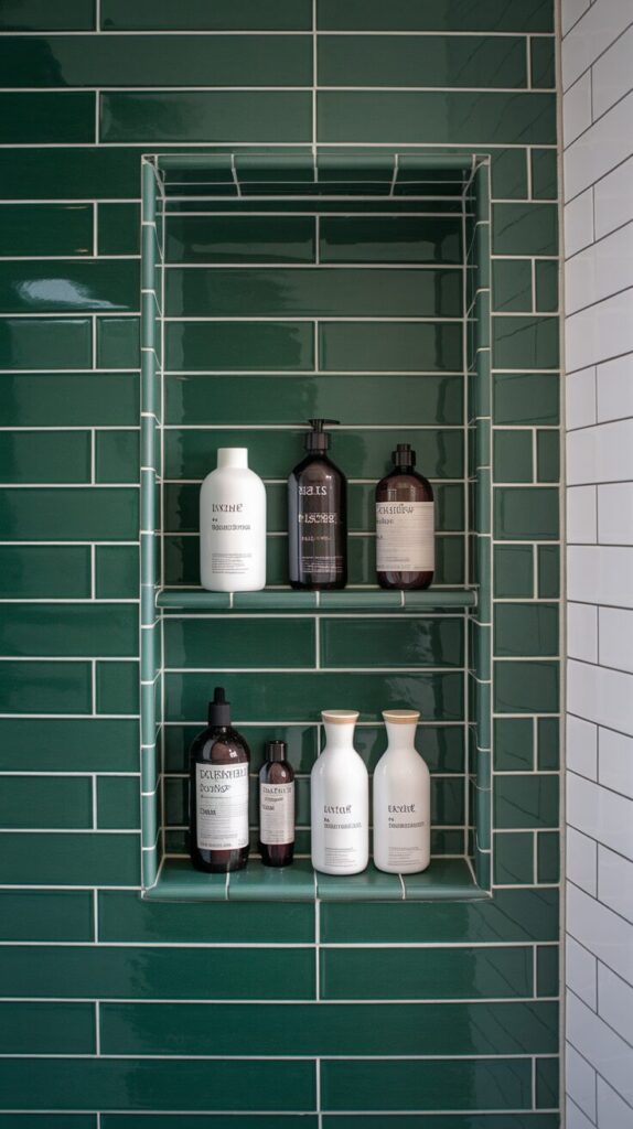 Shower niches often feel boring. Green tile inside the niche adds personality. I love how small details elevate the whole shower.