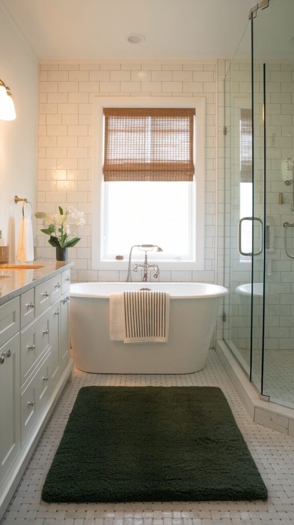 Washable rugs and durable textiles matter more than trend. Choose materials that survive frequent cleaning. A calm bathroom loses its charm fast if it feels high-maintenance.