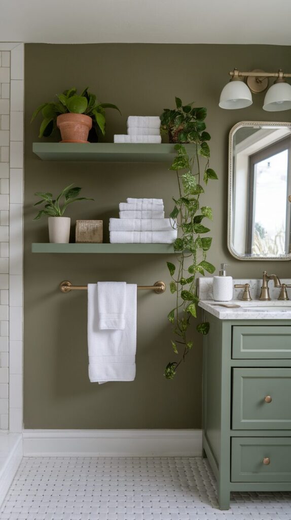 This idea works above toilets or beside mirrors. Green shelves feel intentional. They also break up plain walls.