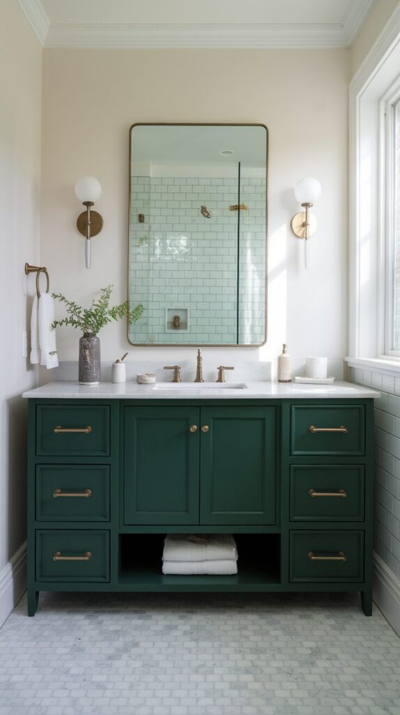 Pair green cabinets with brushed brass or matte black hardware. Keep countertops light to balance the depth. Avoid busy wall colors that compete with the vanity.