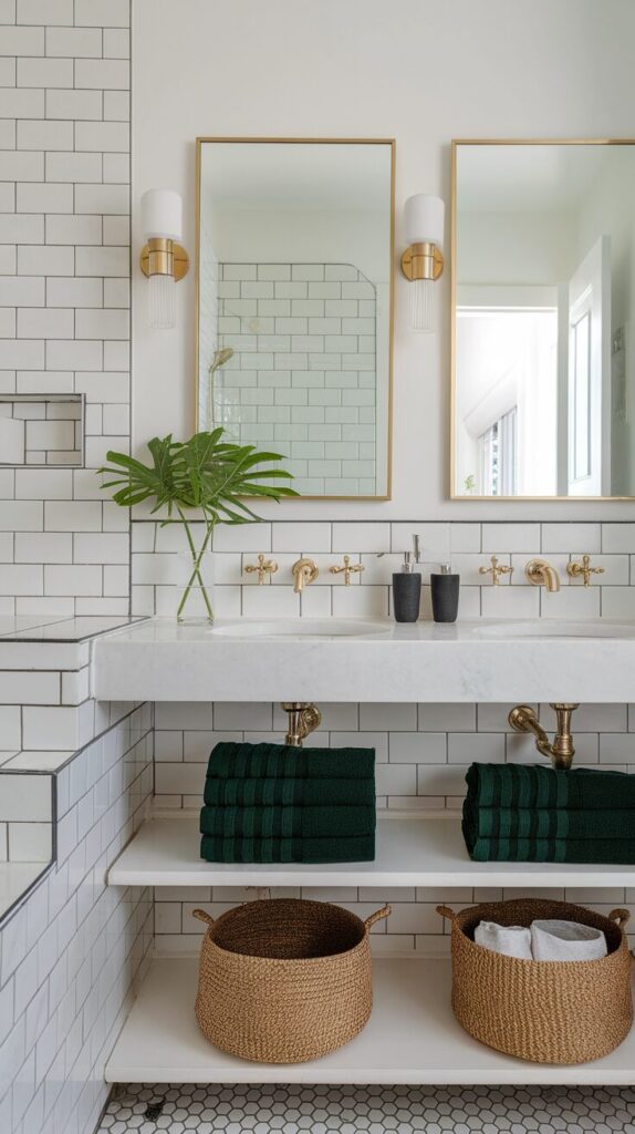 This works especially well in white bathrooms. Green grounds the space visually. It also adds texture instantly.