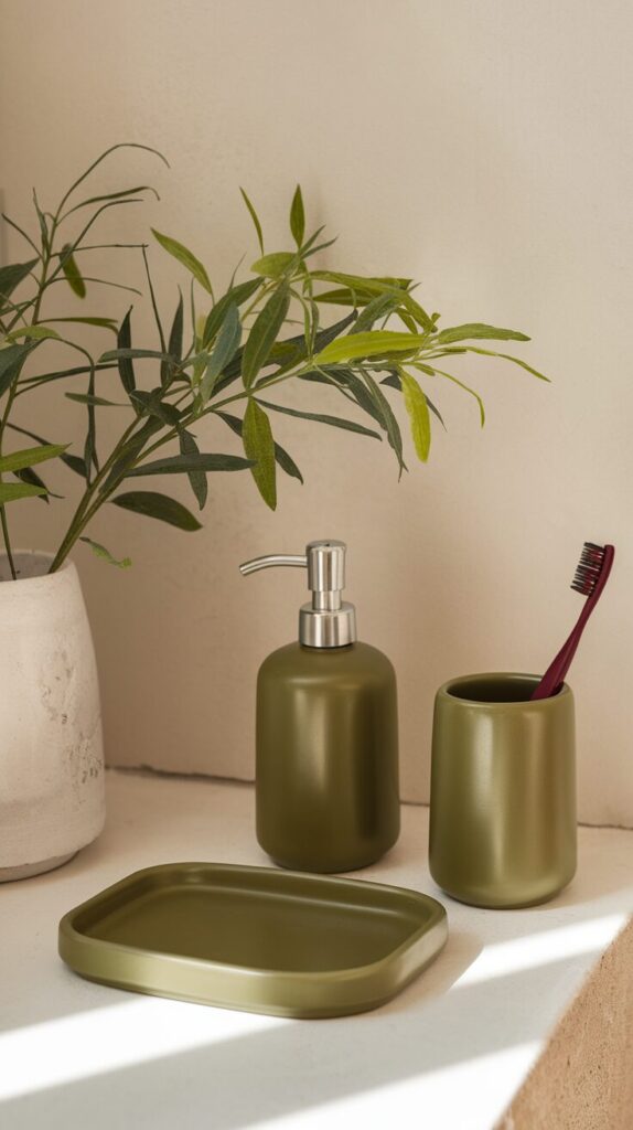 Soap dispensers, trays, and storage jars add just enough color. Olive tones feel mature and timeless. They blend beautifully with most bathroom styles.