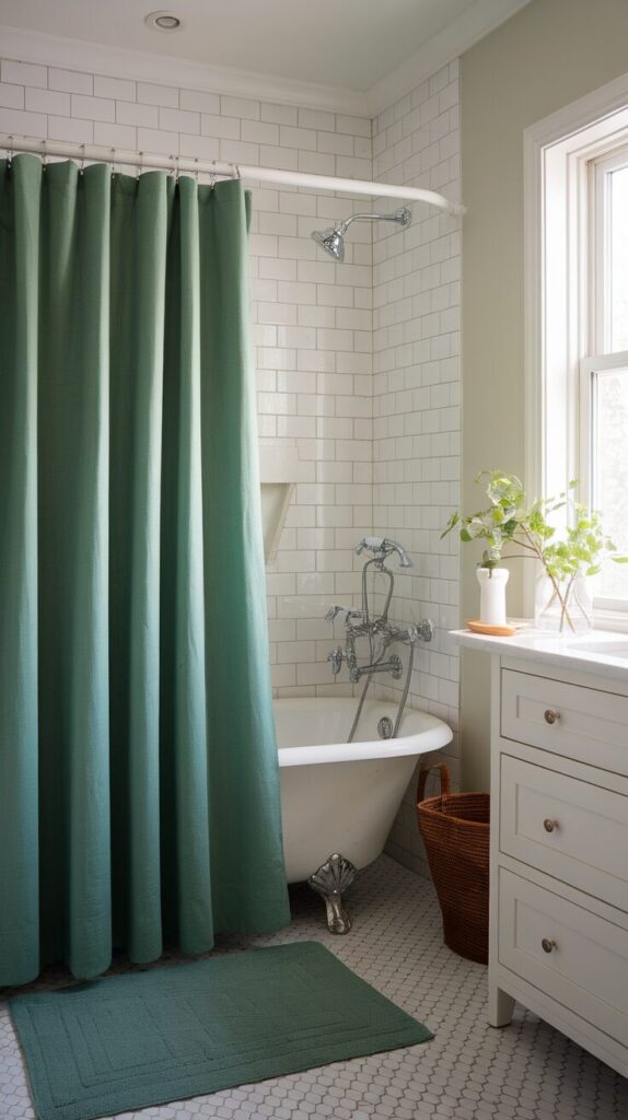 Green curtains soften hard surfaces and add movement. They also create a focal point without renovation. This works especially well in small bathrooms.