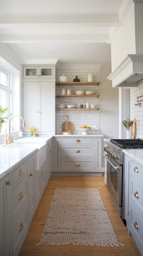 The real beauty here comes from balance. Soft grey cabinetry, white quartz or marble countertops, and simple hardware create a look that feels polished but not fussy. If you want a kitchen that ages gracefully and still looks great in photos five years from now, this one never lets you down.