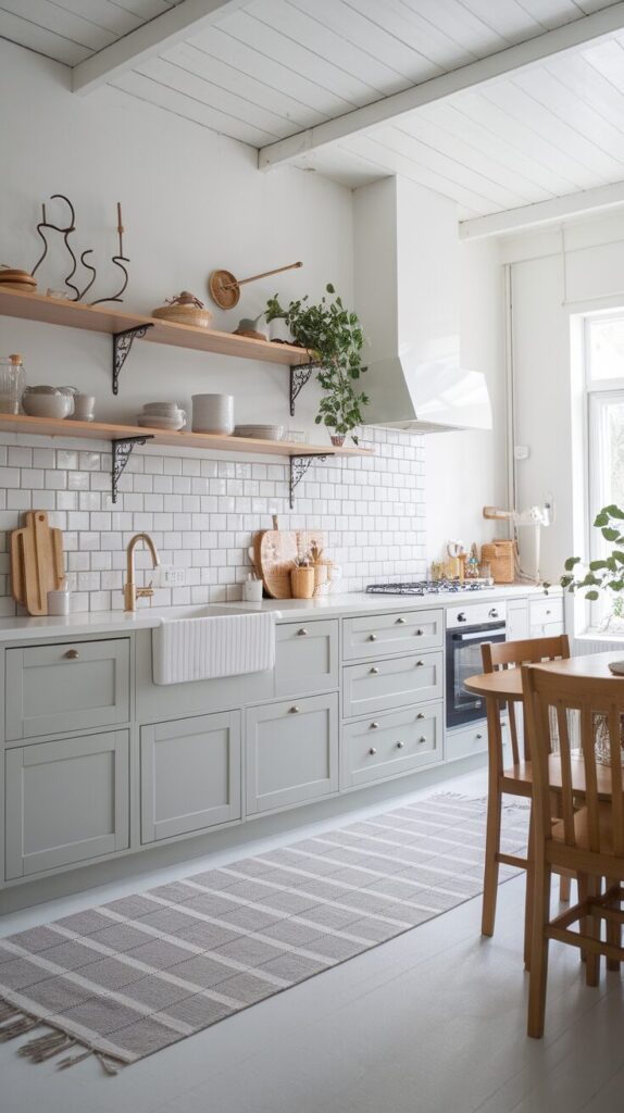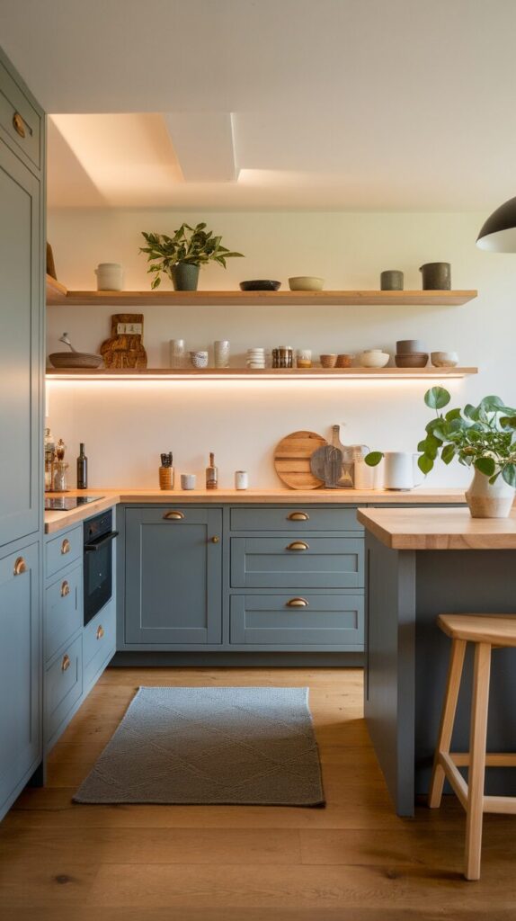 You can mix grey cabinets, wooden open shelves, and natural wood floors for a layered look. The contrast feels intentional and grounded, not chaotic. If you ask me, this combo feels like the kitchen equivalent of a great coffee shop vibe.