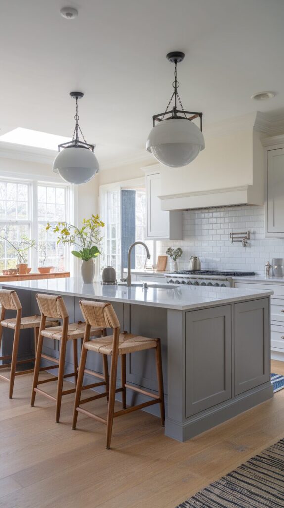 A grey kitchen island anchors the entire space beautifully. I love how it adds contrast without breaking the flow of the kitchen. Even in neutral kitchens, a grey island feels purposeful and stylish.