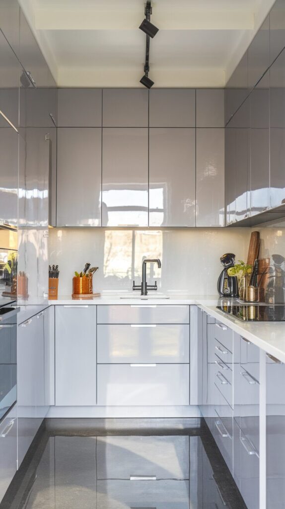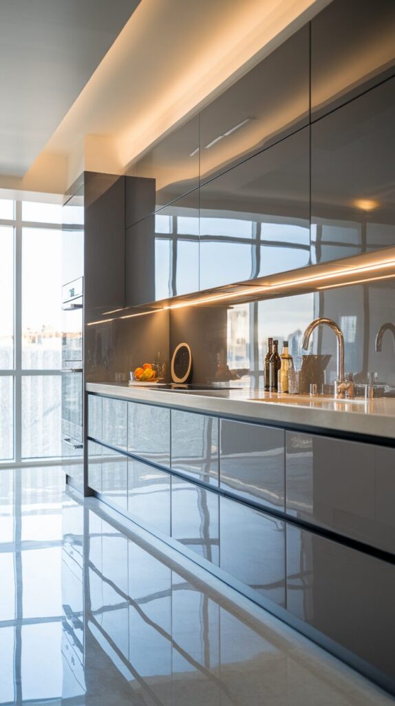 To avoid a sterile look, I avoid overdoing gloss everywhere. Glossy grey cabinets, neutral countertops, and warm lighting create balance. If you love that ultra-modern aesthetic, this one feels spot-on.