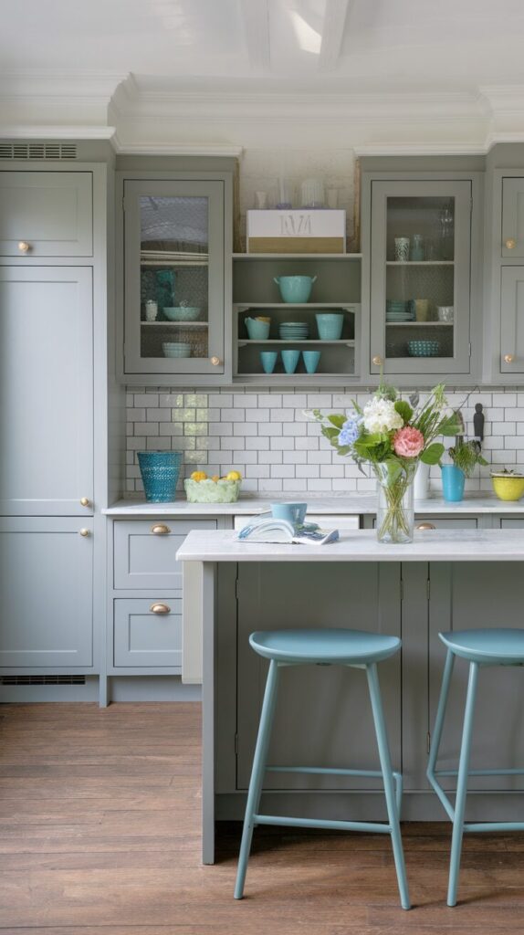 Grey loves color, and that’s not an exaggeration. I’ve seen grey kitchens come alive with blue, green, or even blush accents. Grey acts like the perfect host, letting other colors shine without stealing the spotlight.