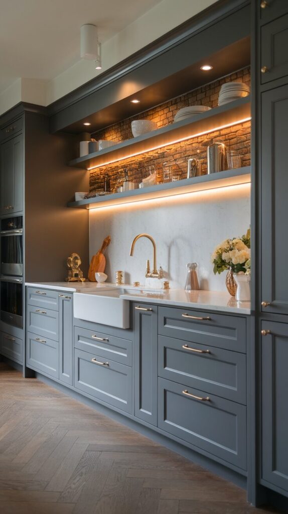 This combo feels elegant in a way that sneaks up on you. Grey cabinets create a calm base, while gold hardware adds just enough sparkle to make things interesting. I used to think gold felt too fancy for everyday kitchens, but modern finishes proved me wrong.