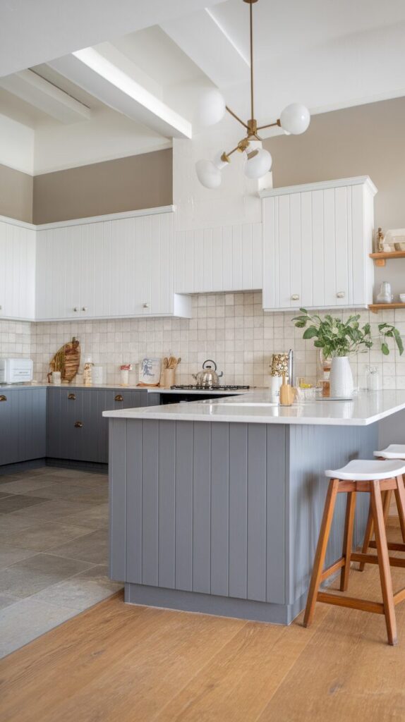 Two-tone kitchens keep things visually exciting without going overboard. I love using grey on lower cabinets and white on upper ones because it grounds the space while keeping it bright. This approach works especially well in open-plan homes.