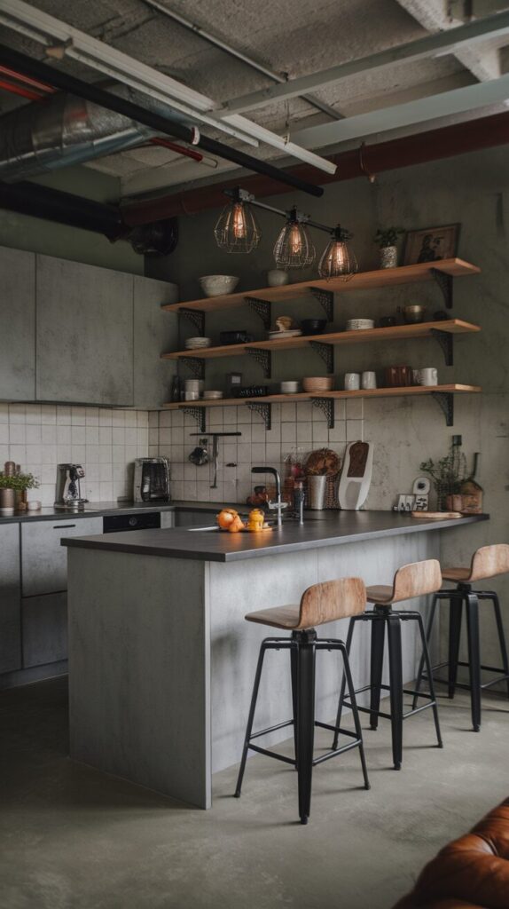 Key elements include concrete-look countertops, metal accents, and open shelving. Pairing grey with black hardware enhances the industrial vibe without overwhelming the space. If you love a kitchen that feels bold and practical, this one delivers.