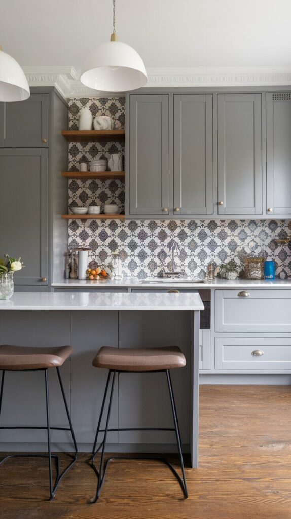 A grey kitchen offers the perfect backdrop for a bold backsplash. I love how grey lets you experiment with patterns, textures, and colors without chaos. This approach keeps the kitchen interesting while maintaining a cohesive look.