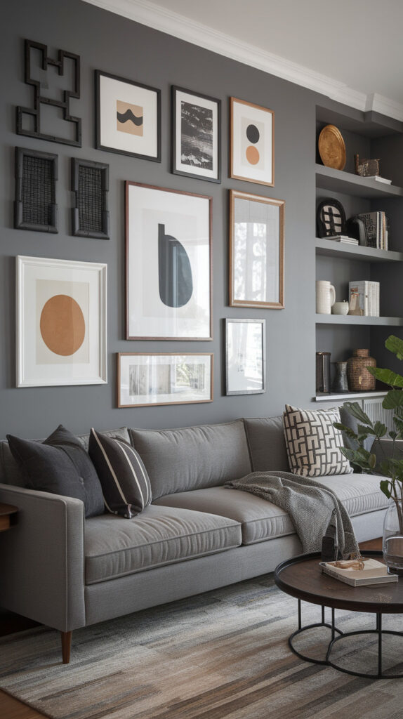 If your grey living room feels too light and washed out, go darker in one spot. A charcoal accent wall adds drama instantly, and it makes everything else in the room look more expensive. It’s basically the “bold lipstick” of home décor.