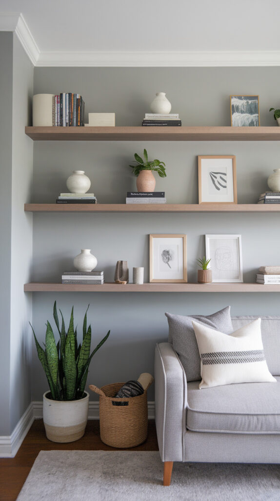 I used to think grey was supposed to look sleek and cool all the time, but honestly, that gets old fast. Once I added warm oak shelves and a wood side table, the room felt softer and more inviting immediately.