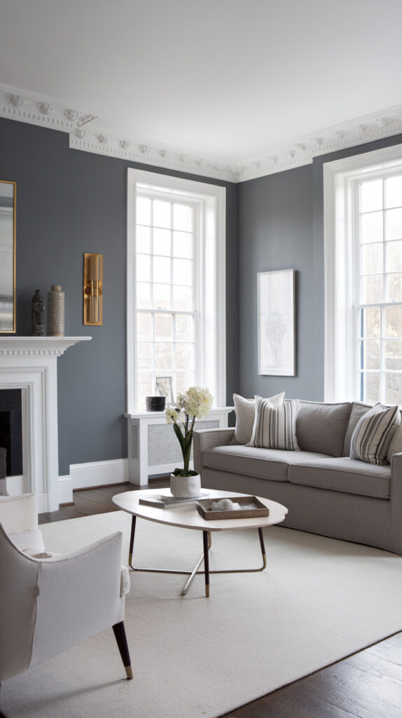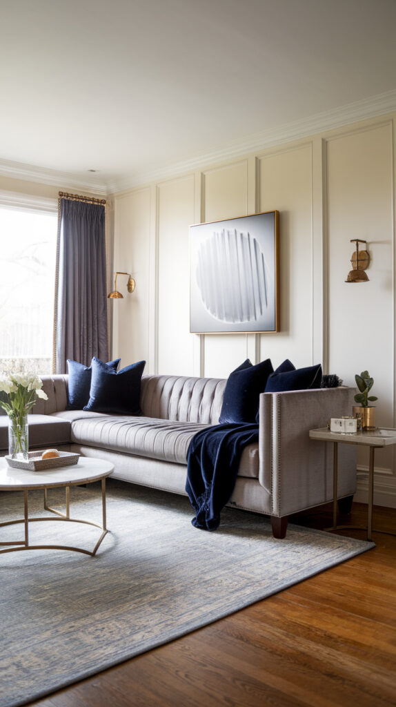 Navy creates contrast while still staying in a calm palette. It adds richness and makes grey feel more intentional. The combination also works in modern, coastal, and transitional living rooms.