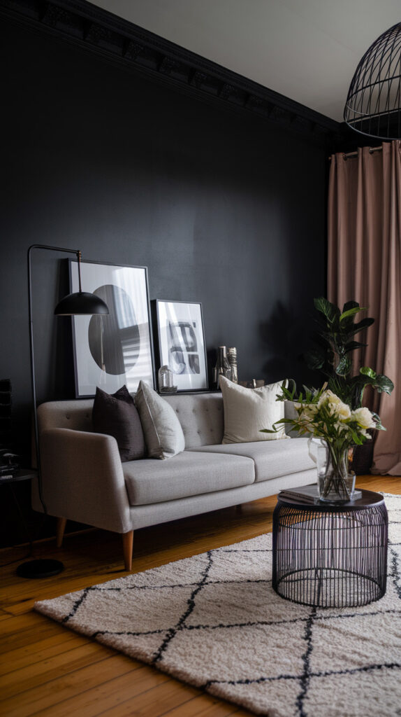 Avoid going too black unless your room has lots of light, because it can feel heavy. Use white trim if you want a crisp modern look, or keep trim grey if you want a seamless moody vibe. Don’t forget lighting, because dark walls need warm lamps.