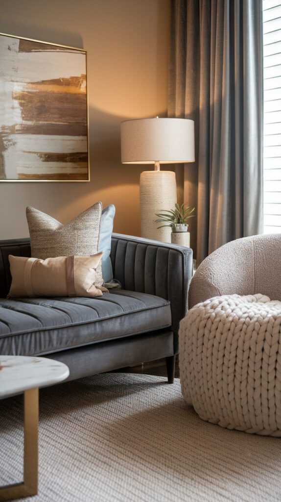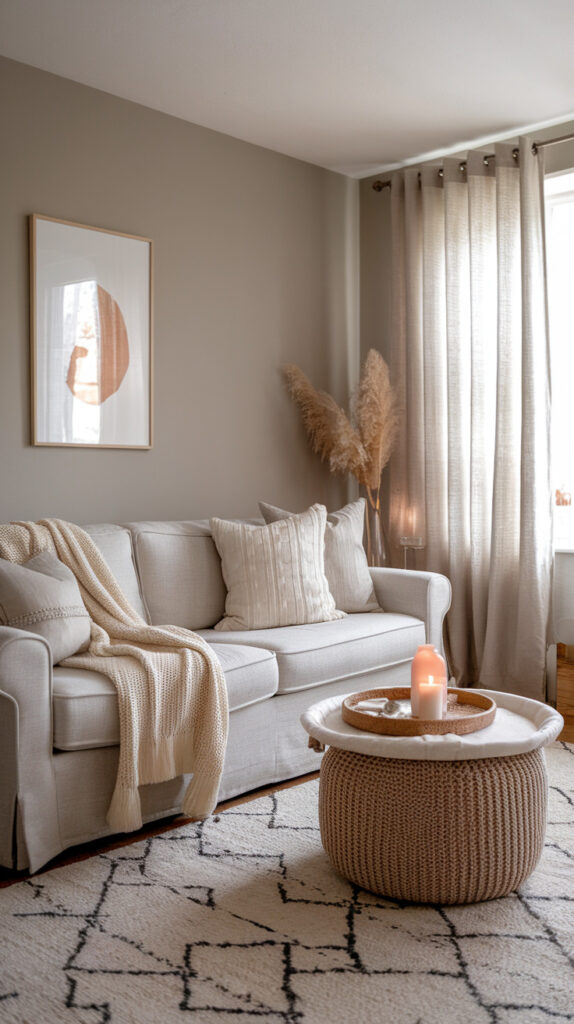 Adding rugs, woven baskets, velvet pillows, or knit throws instantly softens the look. Texture is what makes neutral rooms feel lived-in instead of staged.