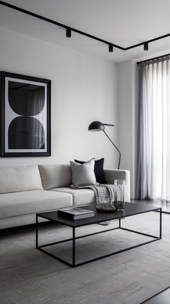 Grey and black together look sharp. The key is using black as a supporting character, not the main event. Think black picture frames, black metal lamps, or a black coffee table base.