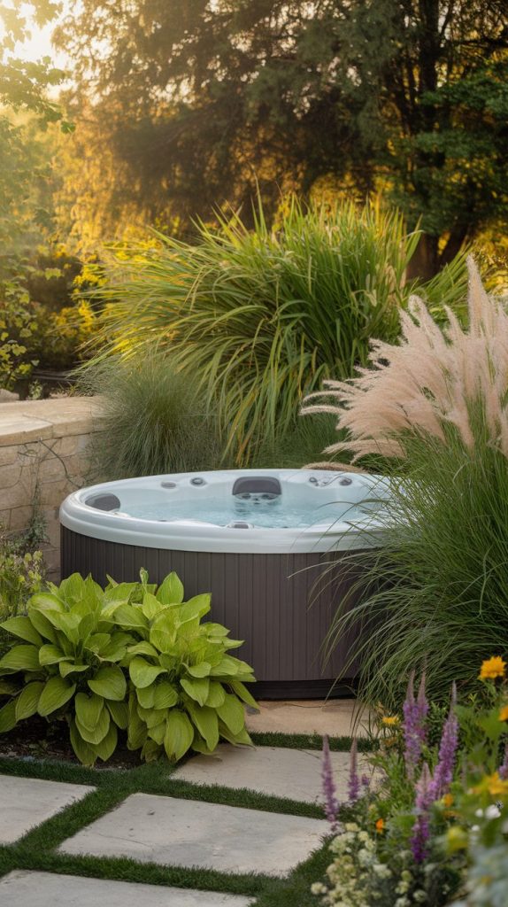 Think tall grasses, leafy shrubs, and flowering plants around the tub. They create softness and make the space feel alive.