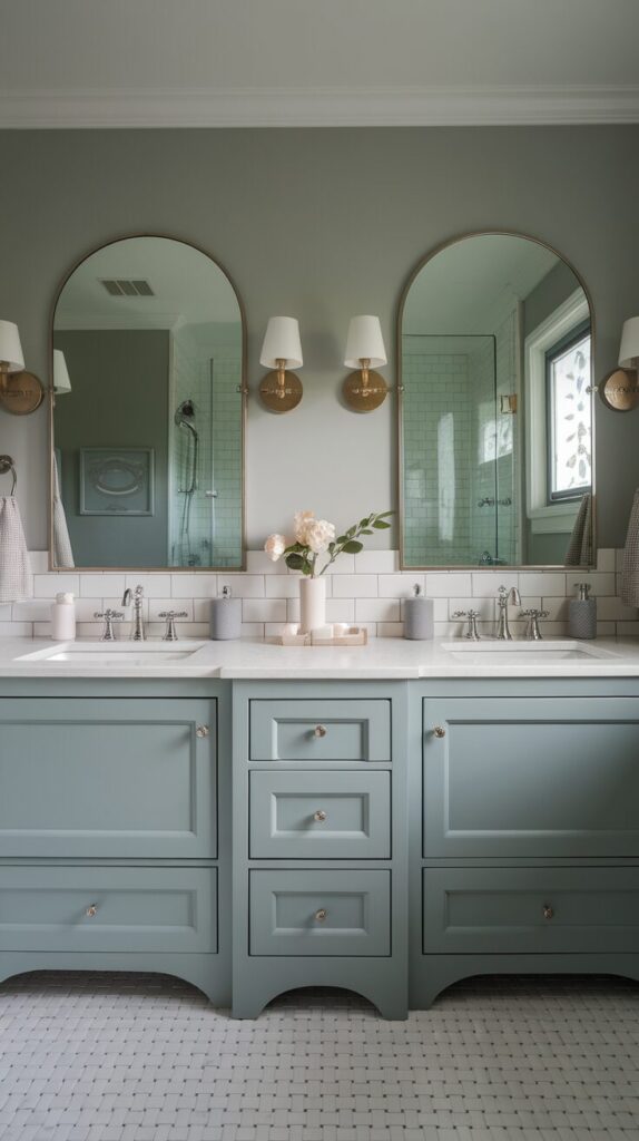 Arched or round mirrors feel softer than rectangles. Skip novelty mirrors that feel dated fast.