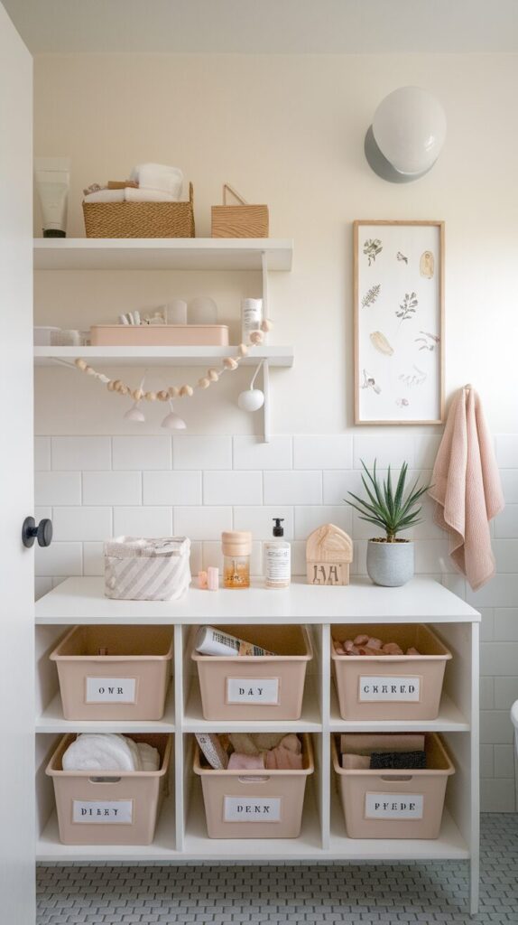 Start by removing anything that doesn’t belong in the bathroom. Add labeled bins or baskets for remaining items so everything has a home. Consistency matters more than perfection.