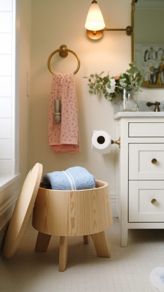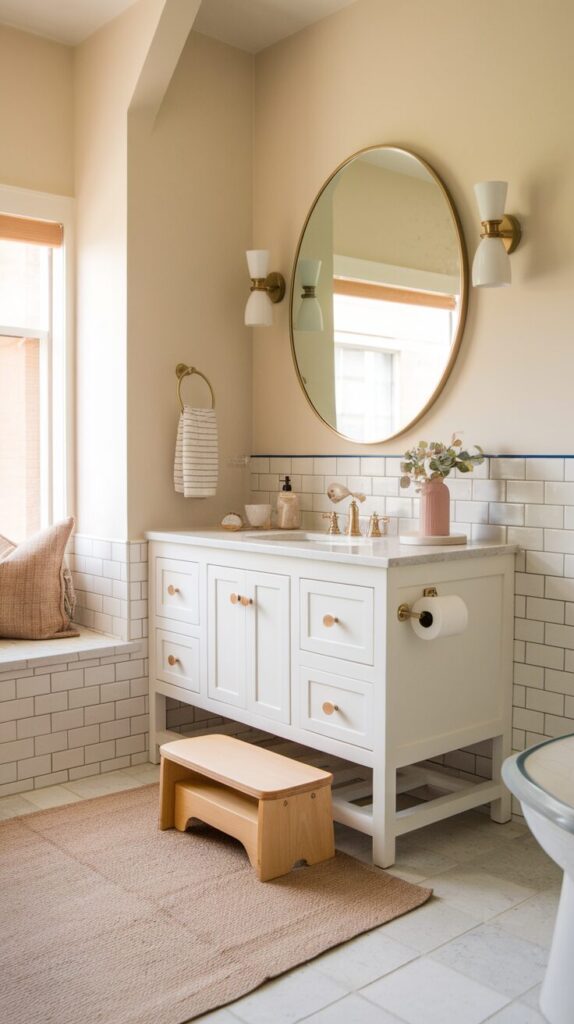 Choose a wooden or neutral-colored stool that blends in with your vanity. When it looks intentional, kids actually put it back instead of tossing it sideways on the floor.