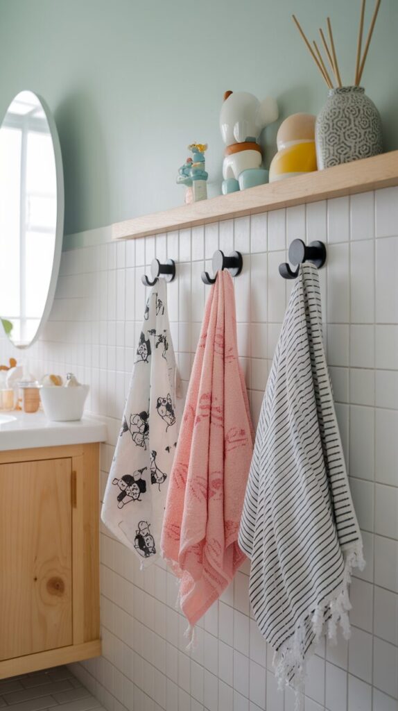 Install hooks at kid height so towels feel easy to hang. Once towels feel accessible, kids use them without reminders.
