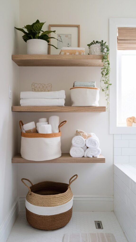 Matching baskets keep shelves calm. Avoid overcrowding or shelves lose their purpose.