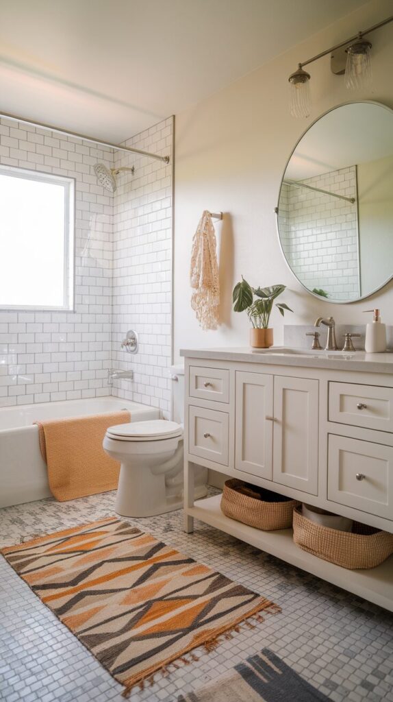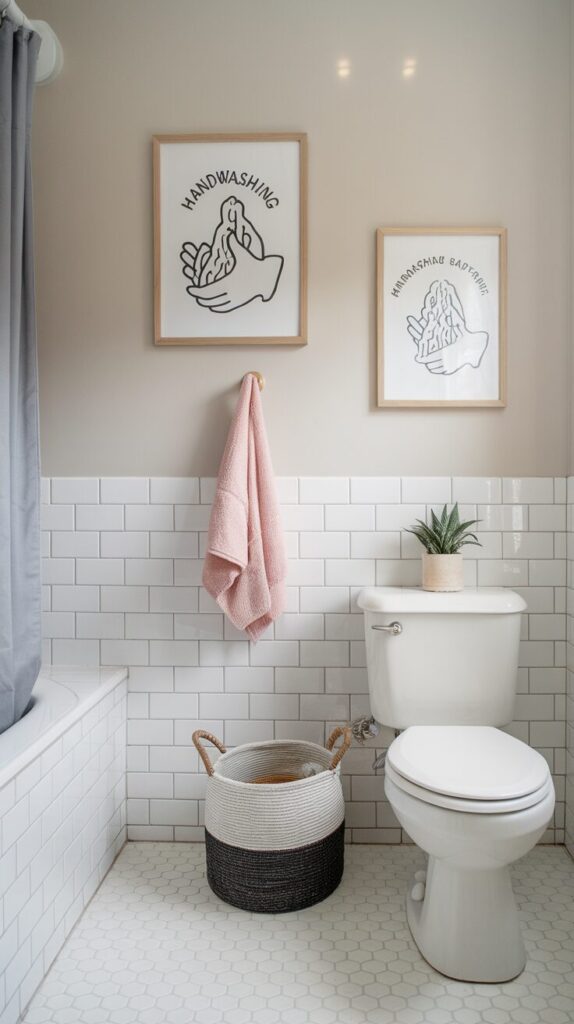Choose one neutral base like soft white, light gray, or pale beige. Add personality through towels and accessories in two accent colors. This approach keeps the room cohesive while still feeling fun.
