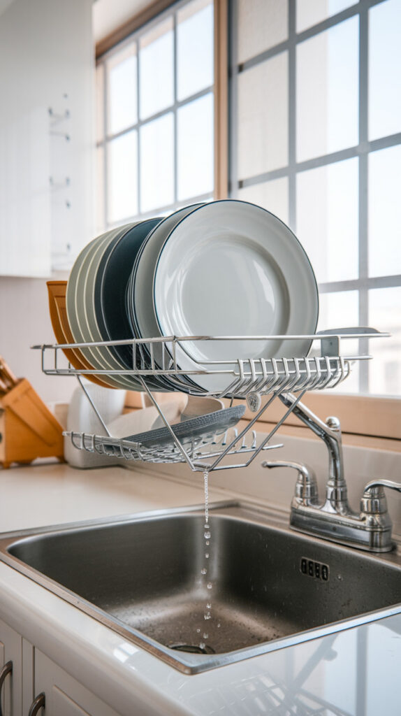 The sink already interrupts the countertop, so using that zone for vertical drying makes sense. It keeps water contained, clears work surfaces, and adds storage without forcing another bulky item into the room.