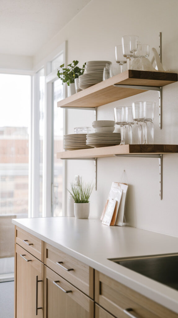 Floating shelves remove visual weight while still giving everyday dishes and glasses a place to live. They also force a little restraint, which small kitchens desperately need because too much hidden storage often turns into a junk drawer with doors.