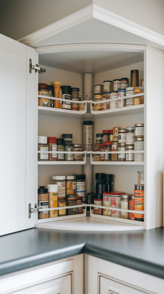 - Use one lazy Susan per category, like spices, oils, or canned goods.