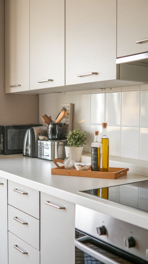 A minimal counter does not need to look bare or cold. One tray, one utensil crock, or one pretty functional item usually looks much better than six cute things competing for the same six inches.